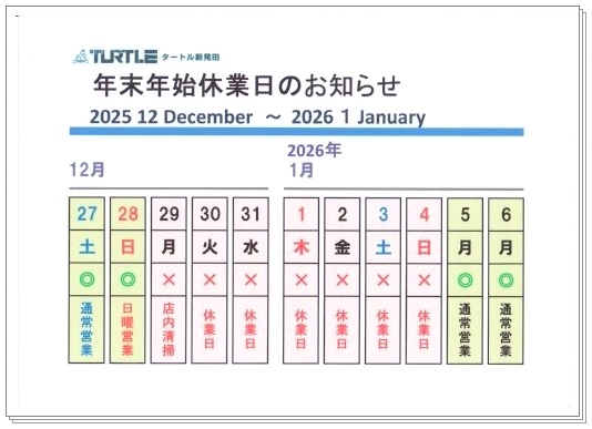 タートル新発田店の年末年始休業日についてお知らせ致します。